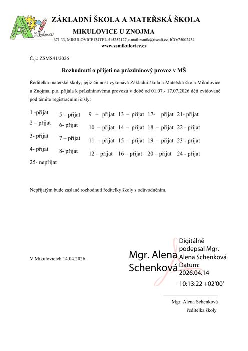 Úvod > Mateřská škola > Aktuálně > Rozhodnutí o přijetí na prázdninový provoz v MŠ